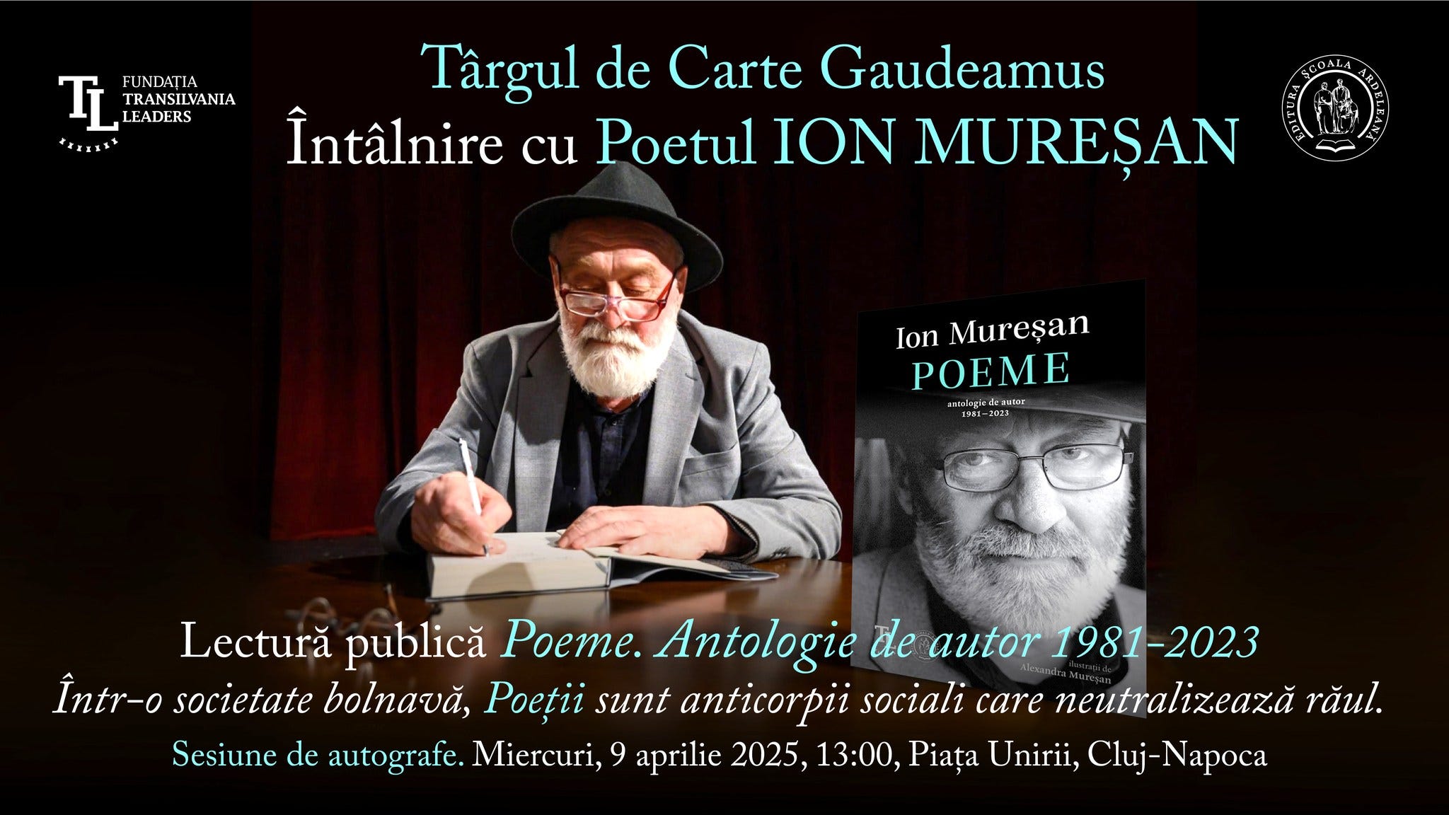 📖 Întâlnire cu poetul Ion Mureșan la Gaudeamus Cluj de la ora 13:00. Lectură publică din volumul „Poeme. Antologie de autor 1981-2023” de Ion Mureșan, urmată de o sesiune de autografe. Evenimentul va avea loc în Piața Unirii. „Într-o societate bolnavă, Poeții sunt anticorpii sociali care neutralizează răul.” (Ion Mureșan)