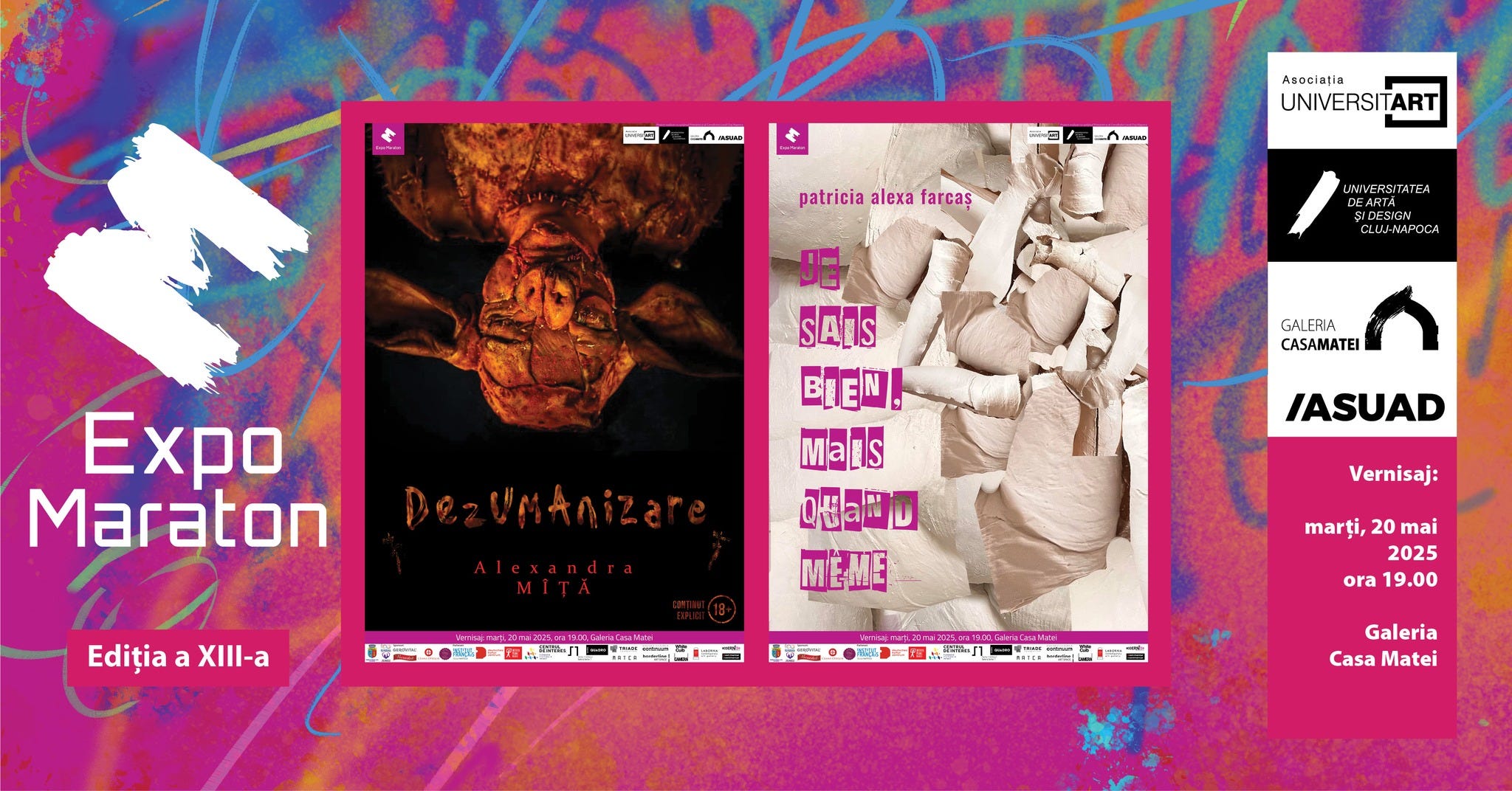 🖼️ Expo Maraton #5: Alexandra Mîță / Patricia Fărcaș de la ora 19:00 la Galeria Casa Matei. Competiția de proiecte expoziționale individuale Expo Maraton 2025, Universitatea de Artă și Design din Cluj: votul se desfășoară la fața locului. Detalii despre expoziții și concepte: „Dezumanizare" de Alexandra Mîță reconstituie simbolic degradarea spirituală a omului contemporan, printr-o scenografie viscerală inspirată de ritualul tradițional al tăierii porcului, cu valențe sacre, tot mai estompate în imaginarul colectiv actual. Menționăm faptul că această expoziție este recomandată persoanelor cu vârsta de peste 18 ani. Proiectul Patriciei Farcaș „Je sais bien, mais quand même” (Știu foarte bine, dar totuși), surprinde tensiunea dintre forță și fragilitate în sport, un portal care oferă emancipare și totuși, sub pretextul performanței, pune în pericol atletele, normalizând violența sexuală.