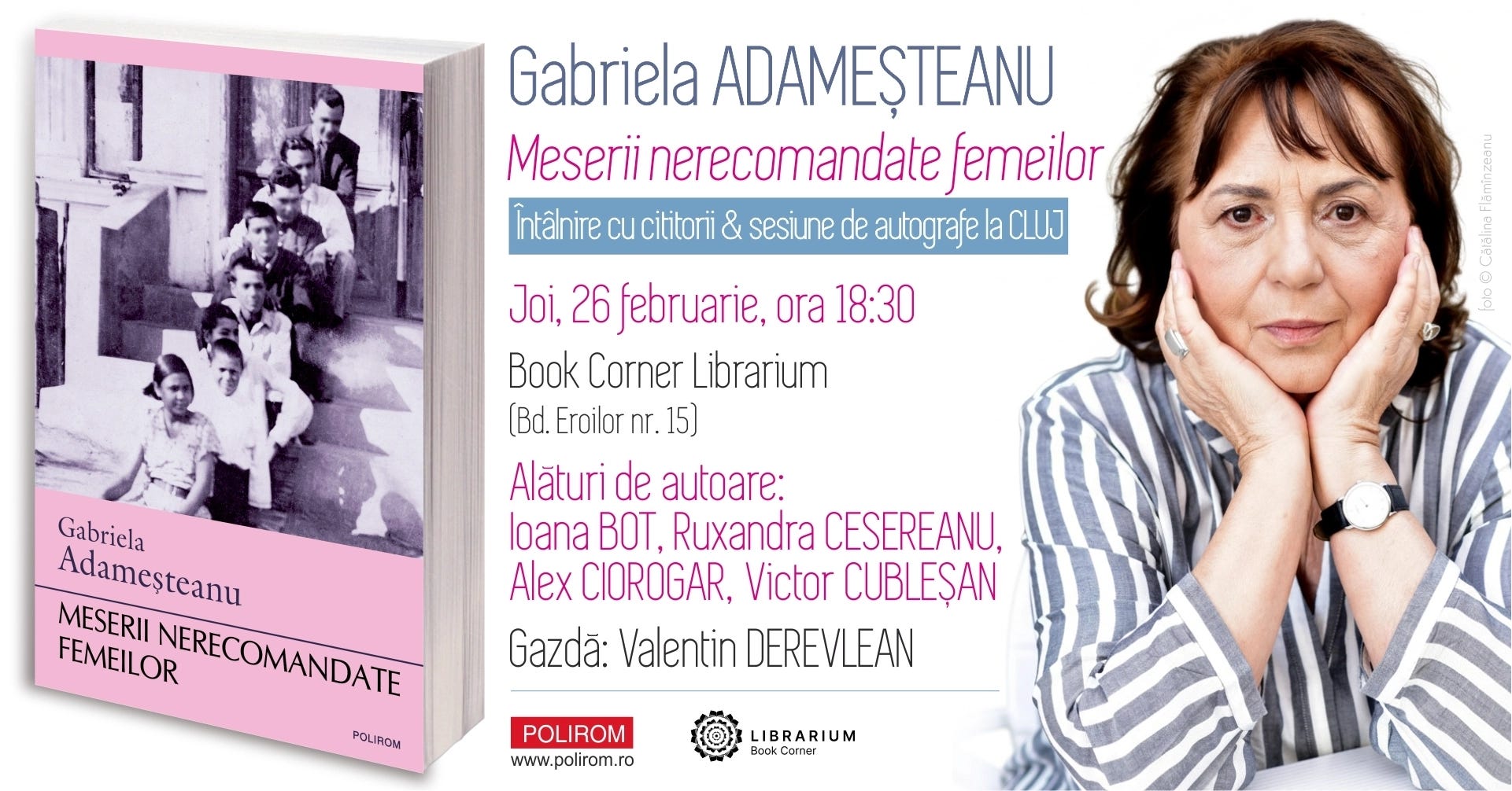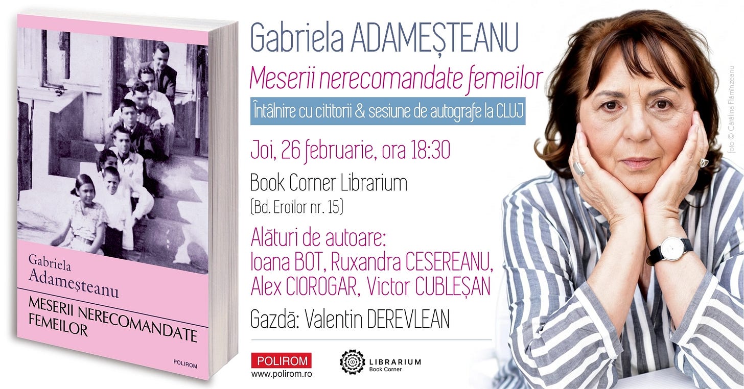 📖 Lansare de carte și sesiune de autografe: „Meserii nerecomandate femeilor” de Gabriela Adameşteanu de la ora 18:30 la Book Corner Librarium. Despre volum: „Meserii nerecomandate femeilor este o carte de memorialistică remarcabilă, singulară în literatura română. Gabriela Adameșteanu lucrează cu temele majore ale universului ei artistic, întoarse spre propria viață: feminitatea și familia (câte bariere sunt până la a simți încrederea și apropierea pe care le promit). La ele se adaugă sinuozitățile condiției de scriitoare. Povestindu-și biografia, cu farmecul epic deja cunoscut (în care intră necruțarea, aici de sine), autoarea încearcă s-o facă inteligibilă prin intermediul amintirilor personale și prin explicații furnizate de o istorie convulsivă. Este o carte despre trecut (ca orice carte de memorii), îndreptată decis spre viitor.” (Sanda Cordoș)